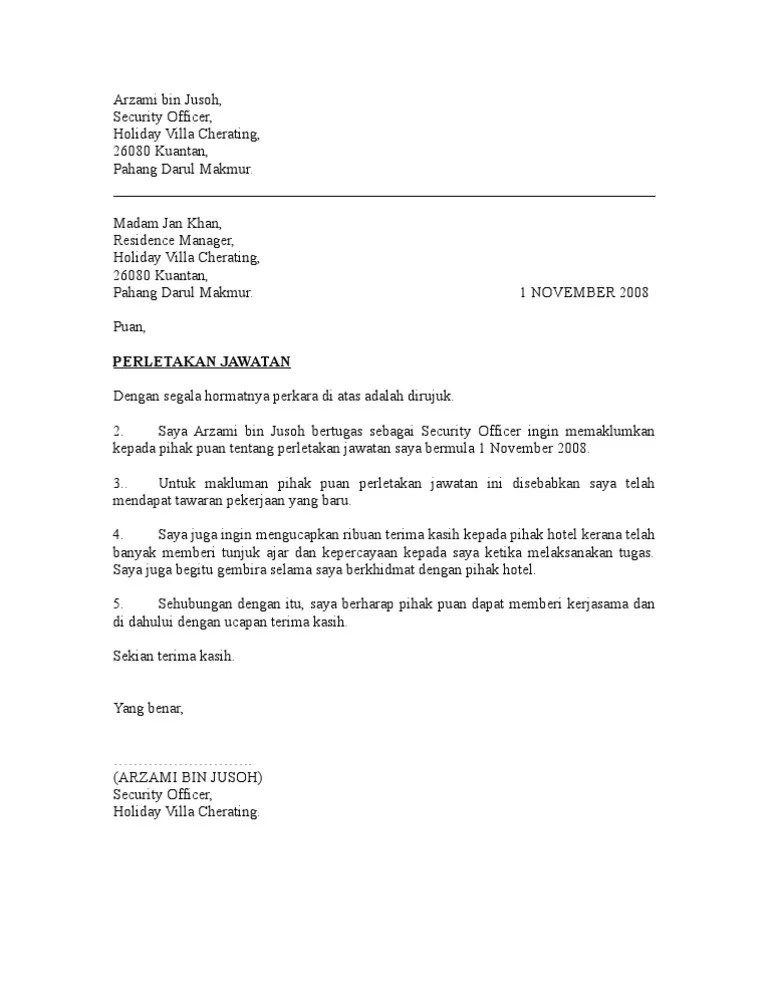 Contoh surat perletakan jawatan notis sebulan. Cara buat surat rasmi resignation letter notis 24 jam 1 bulan kepada majikan . Notis 24 jam download notis sebulan download jadi bagi anda yang telah mendapat kerja dan jawatan . Contoh lengkap surat berhenti kerja dengan betul bagi notis 24 jam 2 minggu sebulan. 3 salinan surat perjanjian sebelum berhenti kerja.